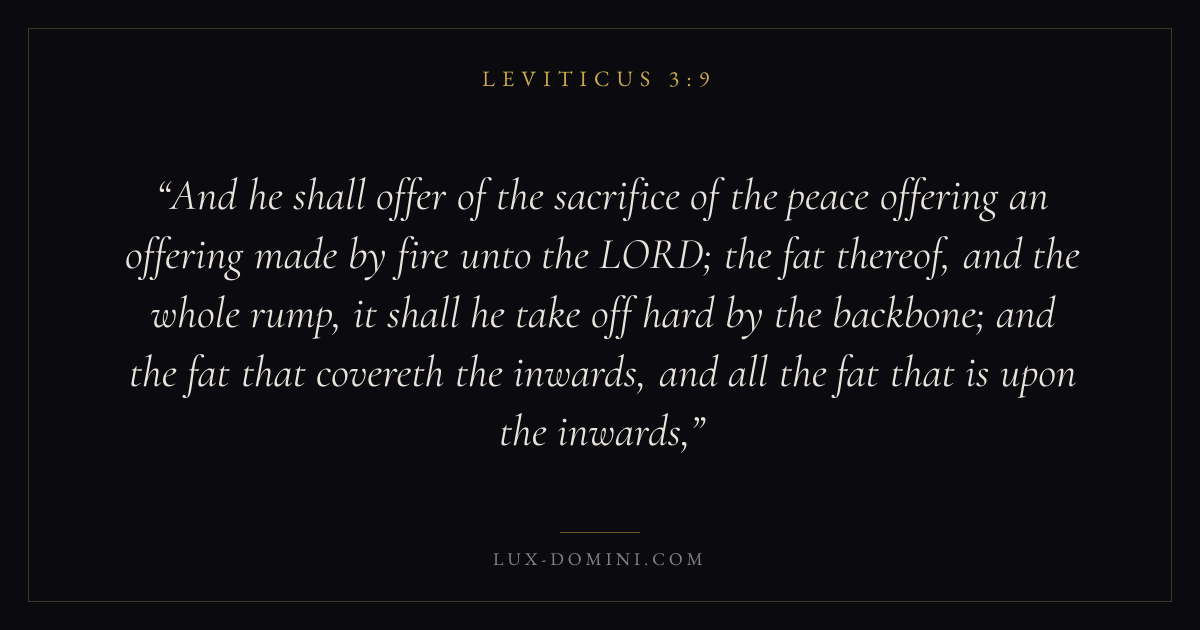 And he shall offer of the sacrifice of the peace offering an offering made by fire unto the LORD; the fat thereof, and the whole rump, it shall he take off hard by the backbone; and the fat that covereth the inwards, and all the fat that is upon the inwards,
