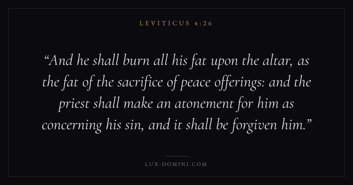 And he shall burn all his fat upon the altar, as the fat of the sacrifice of peace offerings: and the priest shall make an atonement for him as concerning his sin, and it shall be forgiven him.