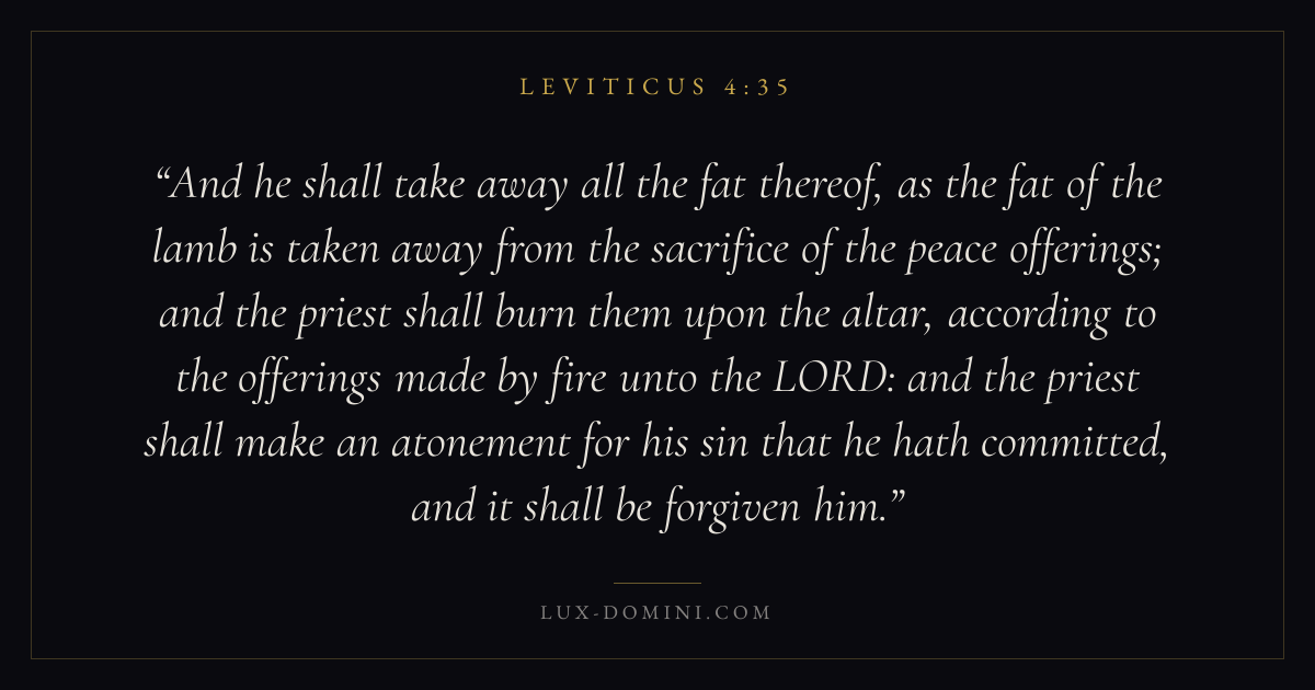 And he shall take away all the fat thereof, as the fat of the lamb is taken away from the sacrifice of the peace offerings; and the priest shall burn them upon the altar, according to the offerings made by fire unto the LORD: and the priest shall make an atonement for his sin that he hath committed, and it shall be forgiven him.