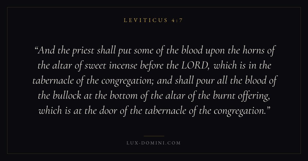 And the priest shall put some of the blood upon the horns of the altar of sweet incense before the LORD, which is in the tabernacle of the congregation; and shall pour all the blood of the bullock at the bottom of the altar of the burnt offering, which is at the door of the tabernacle of the congregation.