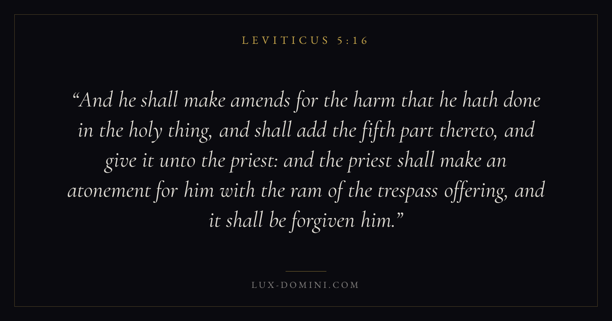 And he shall make amends for the harm that he hath done in the holy thing, and shall add the fifth part thereto, and give it unto the priest: and the priest shall make an atonement for him with the ram of the trespass offering, and it shall be forgiven him.