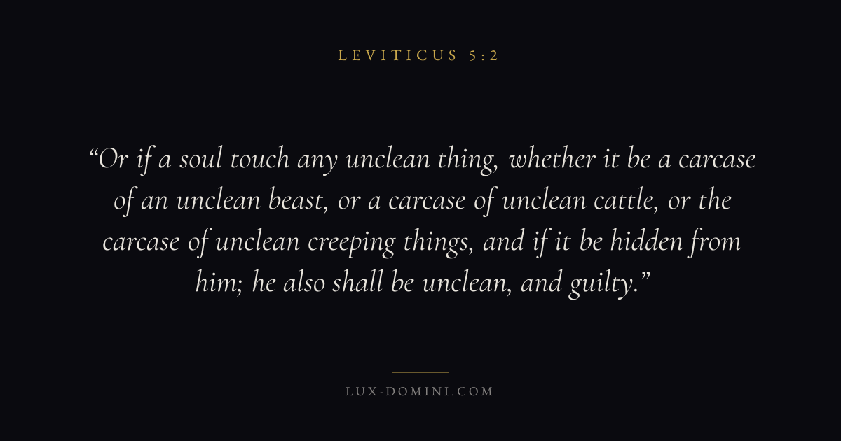 Or if a soul touch any unclean thing, whether it be a carcase of an unclean beast, or a carcase of unclean cattle, or the carcase of unclean creeping things, and if it be hidden from him; he also shall be unclean, and guilty.