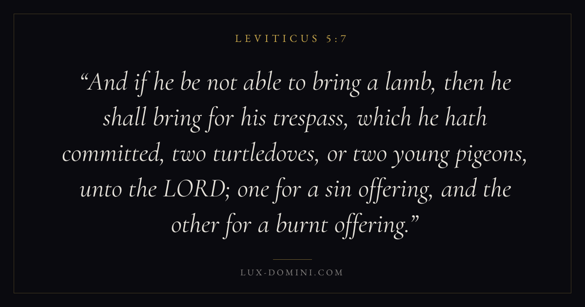 And if he be not able to bring a lamb, then he shall bring for his trespass, which he hath committed, two turtledoves, or two young pigeons, unto the LORD; one for a sin offering, and the other for a burnt offering.