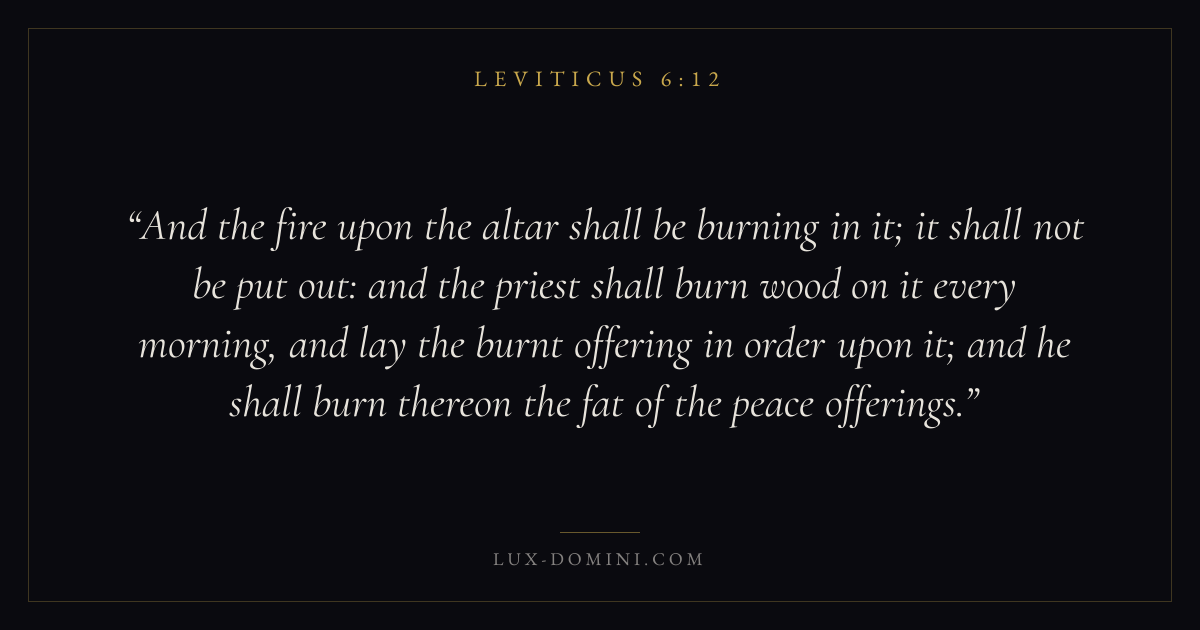 And the fire upon the altar shall be burning in it; it shall not be put out: and the priest shall burn wood on it every morning, and lay the burnt offering in order upon it; and he shall burn thereon the fat of the peace offerings.