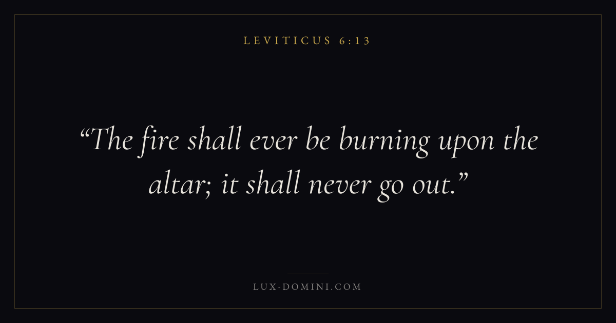 Books / Leviticus / Chapter 6 / Verse 13 ← Leviticus 6:12 Leviticus 6:13 Leviticus 6:14 → The fire shall ever be burning upon the altar; it shall never go out. Download verse card Share on Twitter Share on Facebook Pin it ✦ Key themes HolinessAtonementPriesthoodSacrifice ✦ Leviticus Chapter 6 verses V. 1 V. 2 V. 3 V. 4 V. 5 V. 6 V. 7 V. 8 V. 9 V. 10 V. 11 V. 12 V. 13 V. 14 V. 15 V. 16 V. 17 V. 18 V. 19 V. 20 V. 21 V. 22 V. 23 V. 24 V. 25 V. 26 V. 27 V. 28 V. 29 V. 30