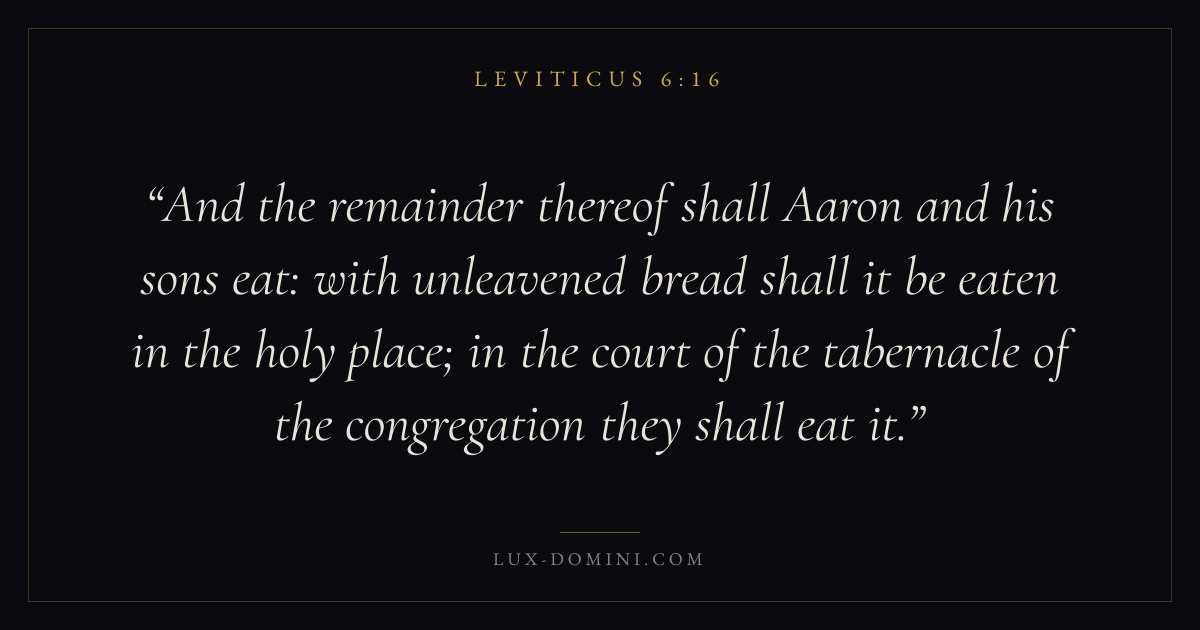And the remainder thereof shall Aaron and his sons eat: with unleavened bread shall it be eaten in the holy place; in the court of the tabernacle of the congregation they shall eat it.