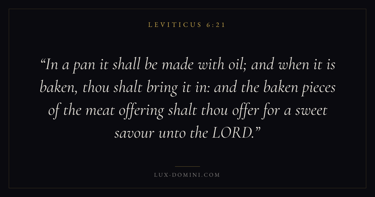 In a pan it shall be made with oil; and when it is baken, thou shalt bring it in: and the baken pieces of the meat offering shalt thou offer for a sweet savour unto the LORD.
