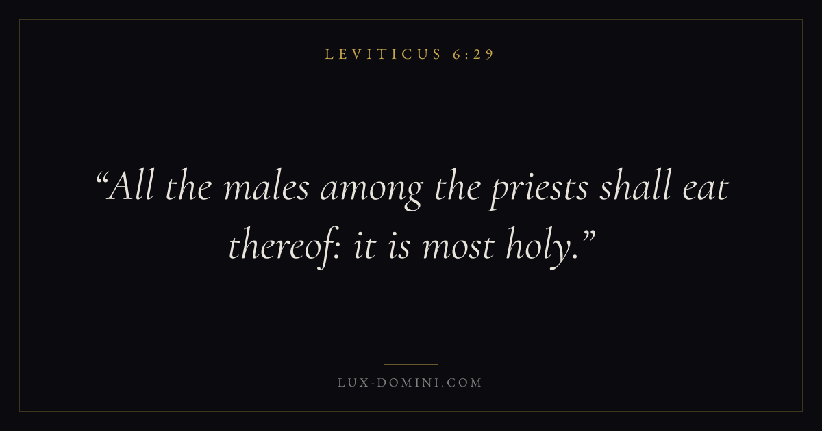 Books / Leviticus / Chapter 6 / Verse 29 ← Leviticus 6:28 Leviticus 6:29 Leviticus 6:30 → All the males among the priests shall eat thereof: it is most holy. Download verse card Share on Twitter Share on Facebook Pin it ✦ Key themes HolinessAtonementPriesthoodSacrifice Read with Leviticus 6:30 ✦ Leviticus Chapter 6 verses V. 1 V. 2 V. 3 V. 4 V. 5 V. 6 V. 7 V. 8 V. 9 V. 10 V. 11 V. 12 V. 13 V. 14 V. 15 V. 16 V. 17 V. 18 V. 19 V. 20 V. 21 V. 22 V. 23 V. 24 V. 25 V. 26 V. 27 V. 28 V. 29 V. 30