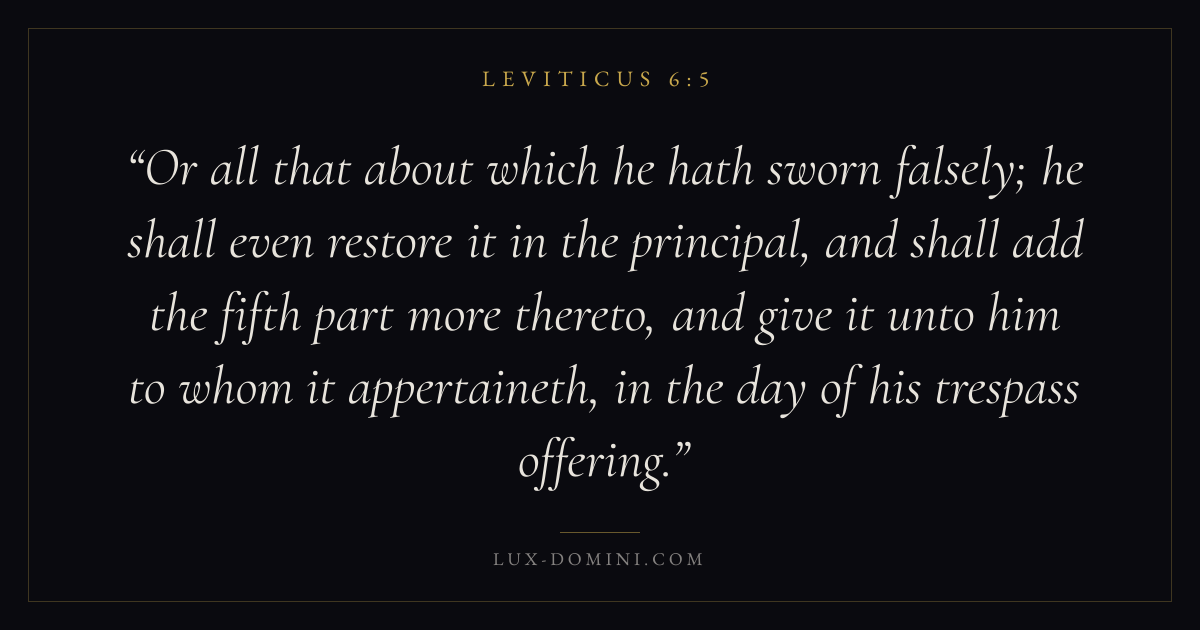 Or all that about which he hath sworn falsely; he shall even restore it in the principal, and shall add the fifth part more thereto, and give it unto him to whom it appertaineth, in the day of his trespass offering.