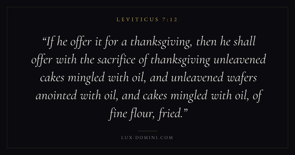 If he offer it for a thanksgiving, then he shall offer with the sacrifice of thanksgiving unleavened cakes mingled with oil, and unleavened wafers anointed with oil, and cakes mingled with oil, of fine flour, fried.