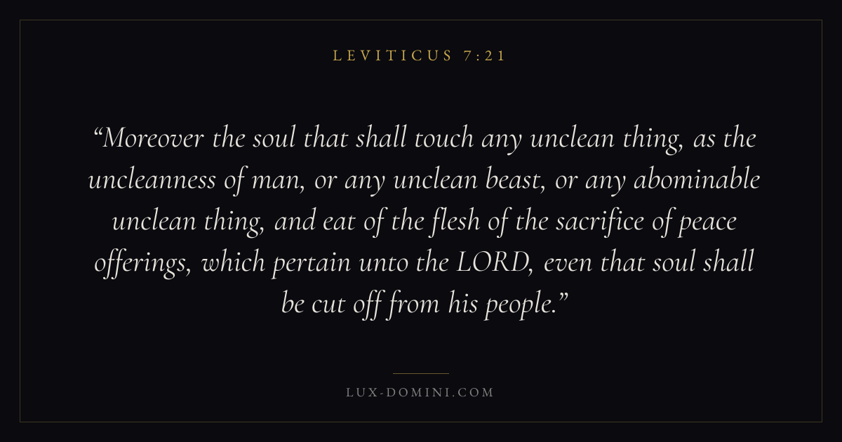 Moreover the soul that shall touch any unclean thing, as the uncleanness of man, or any unclean beast, or any abominable unclean thing, and eat of the flesh of the sacrifice of peace offerings, which pertain unto the LORD, even that soul shall be cut off from his people.