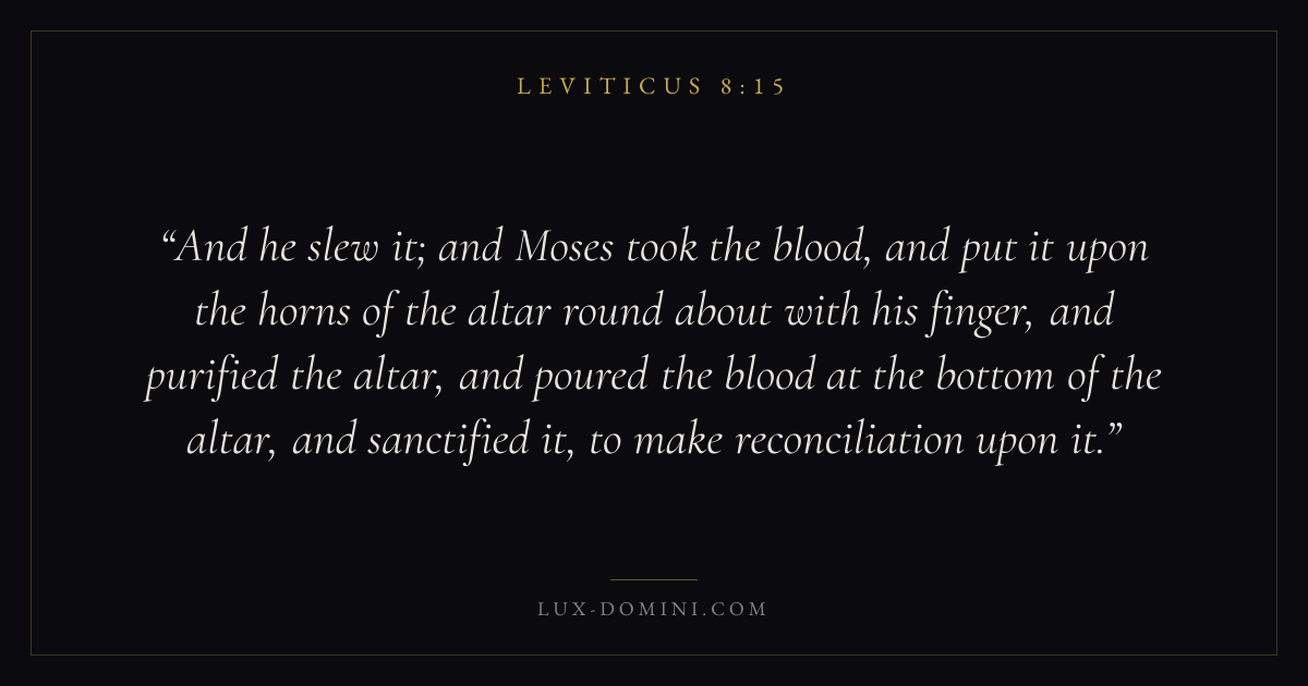And he slew it; and Moses took the blood, and put it upon the horns of the altar round about with his finger, and purified the altar, and poured the blood at the bottom of the altar, and sanctified it, to make reconciliation upon it.