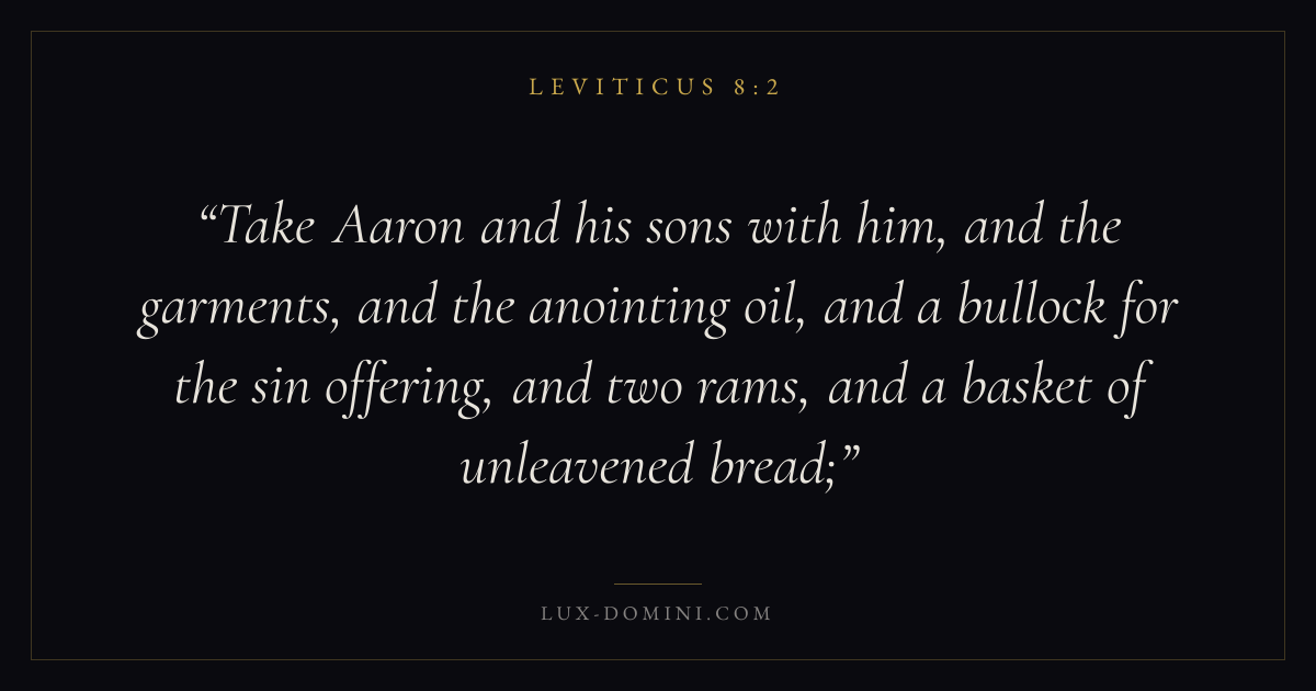 Take Aaron and his sons with him, and the garments, and the anointing oil, and a bullock for the sin offering, and two rams, and a basket of unleavened bread;