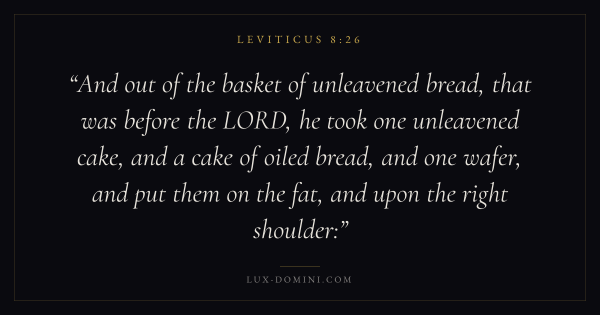 And out of the basket of unleavened bread, that was before the LORD, he took one unleavened cake, and a cake of oiled bread, and one wafer, and put them on the fat, and upon the right shoulder: