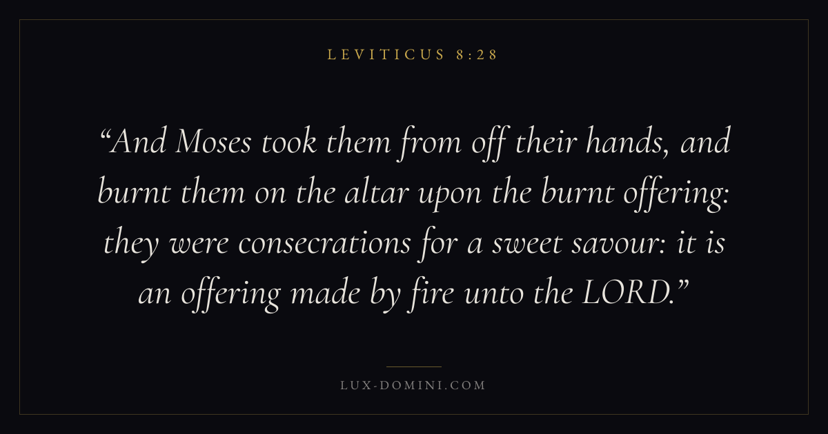 And Moses took them from off their hands, and burnt them on the altar upon the burnt offering: they were consecrations for a sweet savour: it is an offering made by fire unto the LORD.