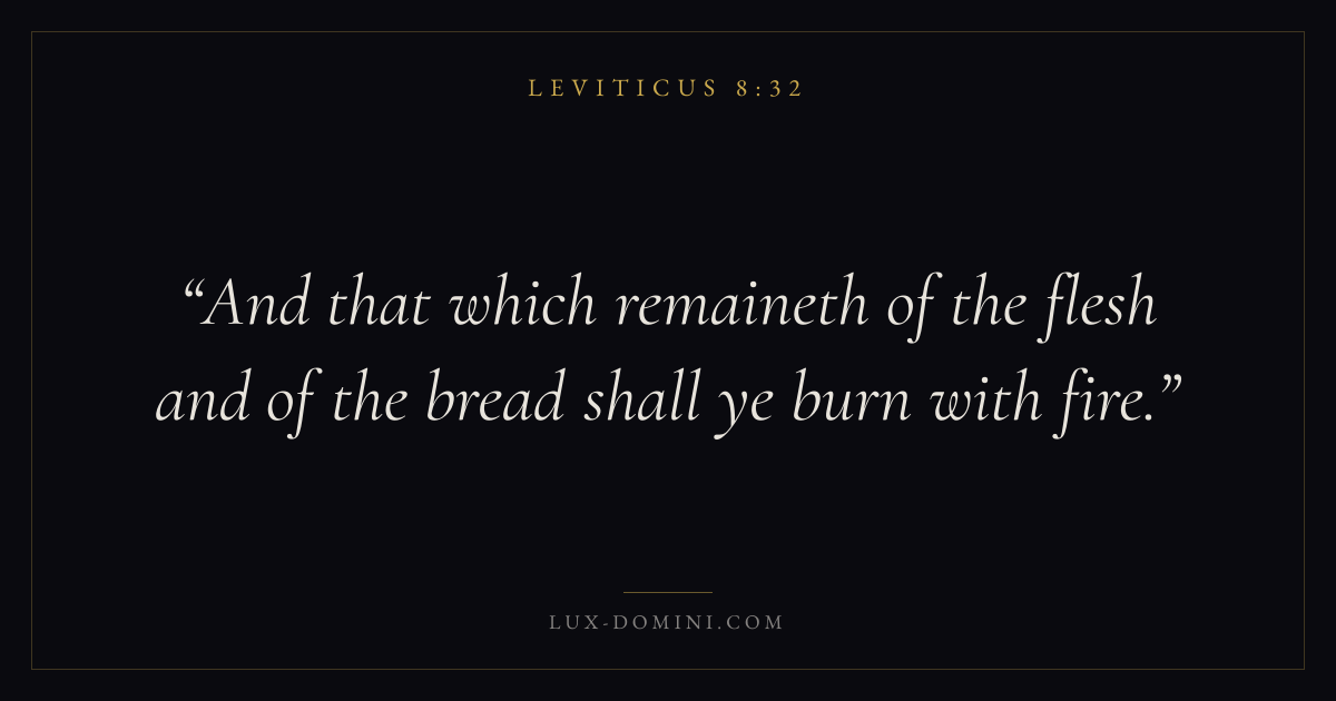 Books / Leviticus / Chapter 8 / Verse 32 ← Leviticus 8:31 Leviticus 8:32 Leviticus 8:33 → And that which remaineth of the flesh and of the bread shall ye burn with fire. Download verse card Share on Twitter Share on Facebook Pin it ✦ Key themes HolinessAtonementPriesthoodSacrifice Read with Leviticus 8:31Leviticus 8:33 ✦ Leviticus Chapter 8 verses V. 1 V. 2 V. 3 V. 4 V. 5 V. 6 V. 7 V. 8 V. 9 V. 10 V. 11 V. 12 V. 13 V. 14 V. 15 V. 16 V. 17 V. 18 V. 19 V. 20 V. 21 V. 22 V. 23 V. 24 V. 25 V. 26 V. 27 V. 28 V. 29 V. 30 V. 31 V. 32 V. 33 V. 34 V. 35 V. 36