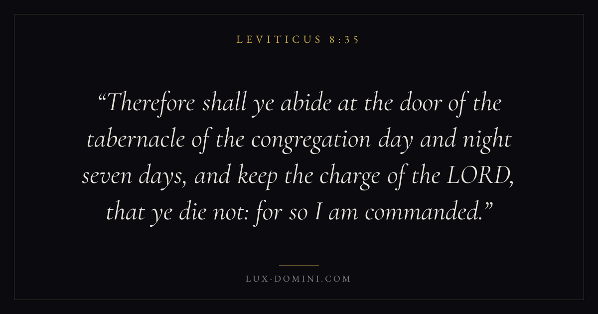Therefore shall ye abide at the door of the tabernacle of the congregation day and night seven days, and keep the charge of the LORD, that ye die not: for so I am commanded.