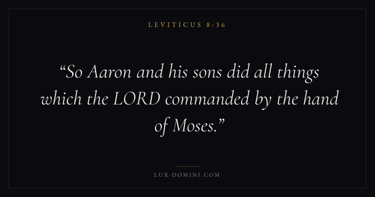 Books / Leviticus / Chapter 8 / Verse 36 ← Leviticus 8:35 Leviticus 8:36 Leviticus 9:1 → So Aaron and his sons did all things which the LORD commanded by the hand of Moses. Download verse card Share on Twitter Share on Facebook Pin it ✦ Key themes HolinessAtonementPriesthoodSacrifice Read with Leviticus 8:34Leviticus 8:35 ✦ Leviticus Chapter 8 verses V. 1 V. 2 V. 3 V. 4 V. 5 V. 6 V. 7 V. 8 V. 9 V. 10 V. 11 V. 12 V. 13 V. 14 V. 15 V. 16 V. 17 V. 18 V. 19 V. 20 V. 21 V. 22 V. 23 V. 24 V. 25 V. 26 V. 27 V. 28 V. 29 V. 30 V. 31 V. 32 V. 33 V. 34 V. 35 V. 36