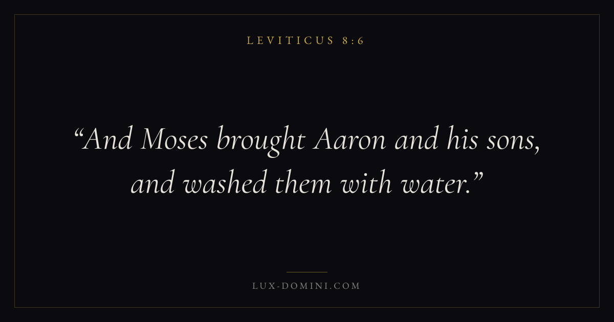 Books / Leviticus / Chapter 8 / Verse 6 ← Leviticus 8:5 Leviticus 8:6 Leviticus 8:7 → And Moses brought Aaron and his sons, and washed them with water. Download verse card Share on Twitter Share on Facebook Pin it ✦ Key themes HolinessAtonementPriesthoodSacrifice Read with Leviticus 8:7Leviticus 8:8 ✦ Leviticus Chapter 8 verses V. 1 V. 2 V. 3 V. 4 V. 5 V. 6 V. 7 V. 8 V. 9 V. 10 V. 11 V. 12 V. 13 V. 14 V. 15 V. 16 V. 17 V. 18 V. 19 V. 20 V. 21 V. 22 V. 23 V. 24 V. 25 V. 26 V. 27 V. 28 V. 29 V. 30 V. 31 V. 32 V. 33 V. 34 V. 35 V. 36