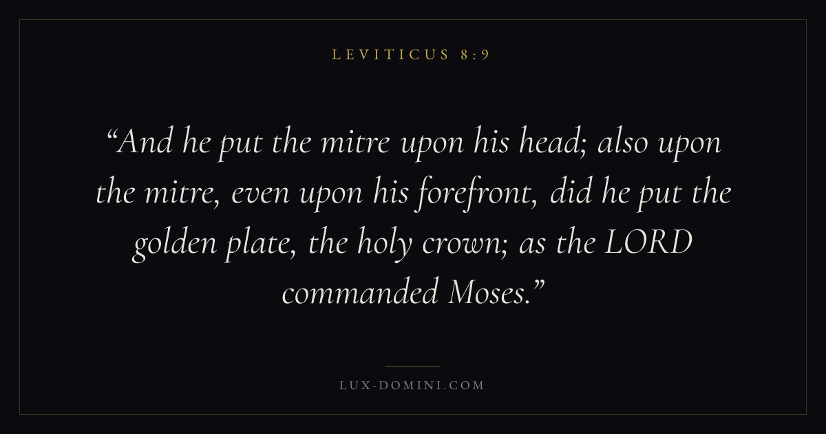 And he put the mitre upon his head; also upon the mitre, even upon his forefront, did he put the golden plate, the holy crown; as the LORD commanded Moses.