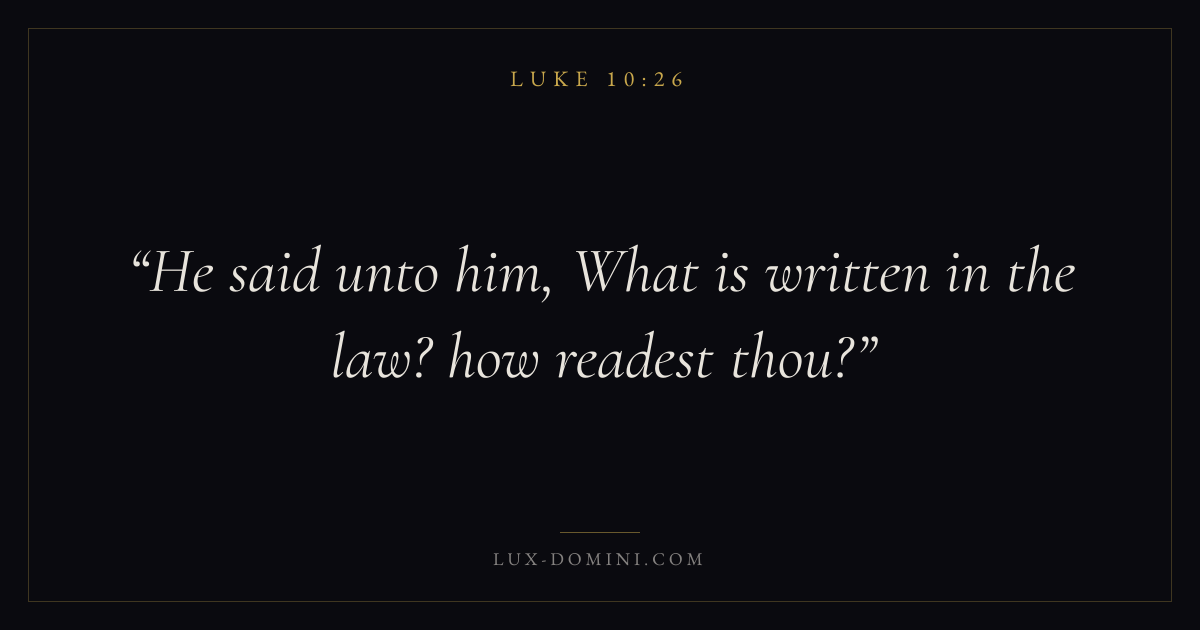 Books / Luke / Chapter 10 / Verse 26 ← Luke 10:25 Luke 10:26 Luke 10:27 → He said unto him, What is written in the law? how readest thou? Download verse card Share on Twitter Share on Facebook Pin it ✦ Key themes LovePrayerJustice and mercySalvationSpirit Read with Luke 10:27Luke 10:28John 3:161 Corinthians 13:4 Related topics Bible verses about loveBible verses about prayerBible verses about justice and mercyBible verses about salvation ✦ Luke Chapter 10 verses V. 1 V. 2 V. 3 V. 4 V. 5 V. 6 V. 7 V. 8 V. 9 V. 10 V. 11 V. 12 V. 13 V. 14 V. 15 V. 16 V. 17 V. 18 V. 19 V. 20 V. 21 V. 22 V. 23 V. 24 V. 25 V. 26 V. 27 V. 28 V. 29 V. 30 V. 31 V. 32 V. 33 V. 34 V. 35 V. 36 V. 37 V. 38 V. 39 V. 40 V. 41 V. 42