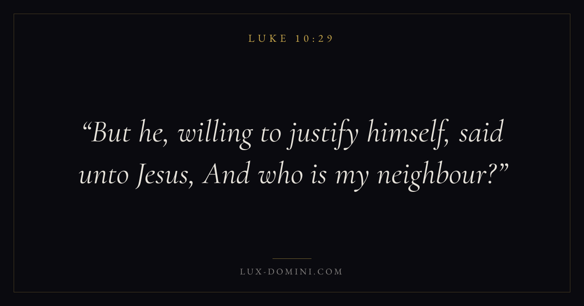 Books / Luke / Chapter 10 / Verse 29 ← Luke 10:28 Luke 10:29 Luke 10:30 → But he, willing to justify himself, said unto Jesus, And who is my neighbour? Download verse card Share on Twitter Share on Facebook Pin it ✦ Key themes LovePrayerJustice and mercySalvationSpirit Read with Luke 10:26Luke 10:27John 3:161 Corinthians 13:4 Related topics Bible verses about loveBible verses about prayerBible verses about justice and mercyBible verses about salvation ✦ Luke Chapter 10 verses V. 1 V. 2 V. 3 V. 4 V. 5 V. 6 V. 7 V. 8 V. 9 V. 10 V. 11 V. 12 V. 13 V. 14 V. 15 V. 16 V. 17 V. 18 V. 19 V. 20 V. 21 V. 22 V. 23 V. 24 V. 25 V. 26 V. 27 V. 28 V. 29 V. 30 V. 31 V. 32 V. 33 V. 34 V. 35 V. 36 V. 37 V. 38 V. 39 V. 40 V. 41 V. 42