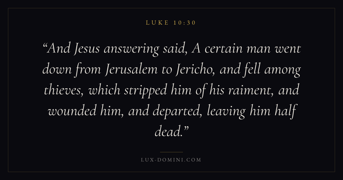 And Jesus answering said, A certain man went down from Jerusalem to Jericho, and fell among thieves, which stripped him of his raiment, and wounded him, and departed, leaving him half dead.