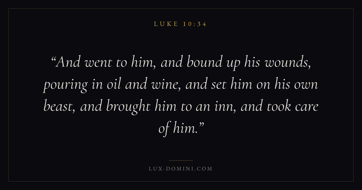 And went to him, and bound up his wounds, pouring in oil and wine, and set him on his own beast, and brought him to an inn, and took care of him.
