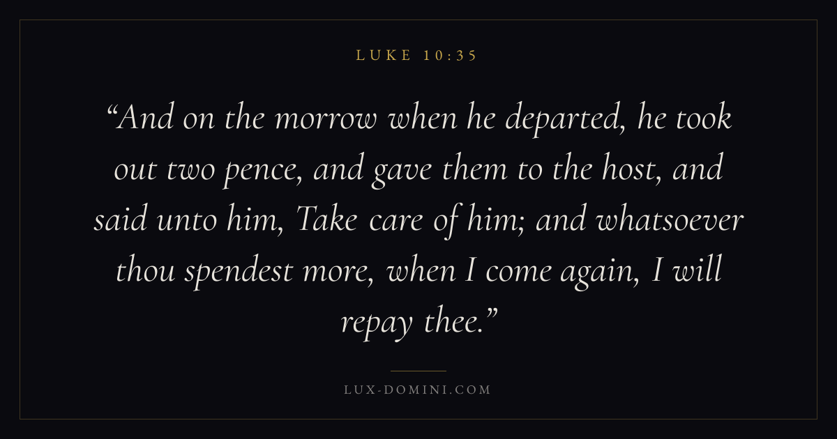 And on the morrow when he departed, he took out two pence, and gave them to the host, and said unto him, Take care of him; and whatsoever thou spendest more, when I come again, I will repay thee.