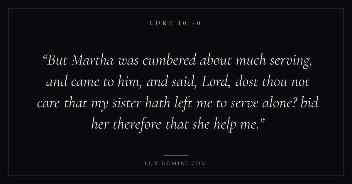 But Martha was cumbered about much serving, and came to him, and said, Lord, dost thou not care that my sister hath left me to serve alone? bid her therefore that she help me.