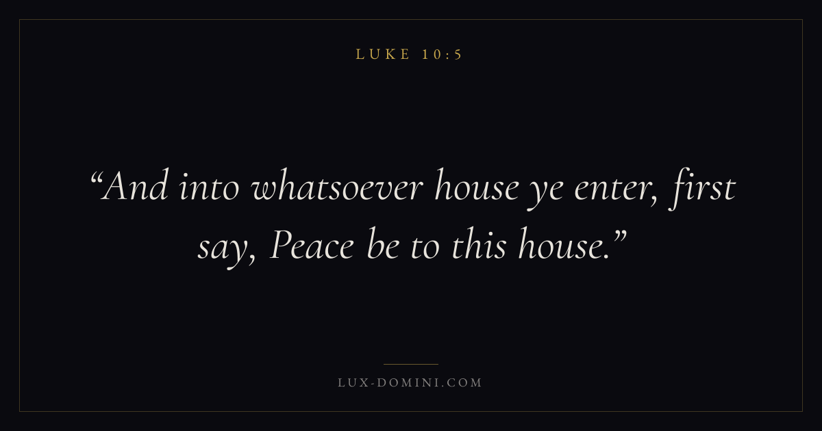 Books / Luke / Chapter 10 / Verse 5 ← Luke 10:4 Luke 10:5 Luke 10:6 → And into whatsoever house ye enter, first say, Peace be to this house. Download verse card Share on Twitter Share on Facebook Pin it ✦ Key themes PrayerJustice and mercySalvationPeaceSpirit Read with Luke 10:4Luke 10:6Matthew 6:9Luke 18:1 Related topics Bible verses about prayerBible verses about justice and mercyBible verses about salvationBible verses about peace ✦ Luke Chapter 10 verses V. 1 V. 2 V. 3 V. 4 V. 5 V. 6 V. 7 V. 8 V. 9 V. 10 V. 11 V. 12 V. 13 V. 14 V. 15 V. 16 V. 17 V. 18 V. 19 V. 20 V. 21 V. 22 V. 23 V. 24 V. 25 V. 26 V. 27 V. 28 V. 29 V. 30 V. 31 V. 32 V. 33 V. 34 V. 35 V. 36 V. 37 V. 38 V. 39 V. 40 V. 41 V. 42