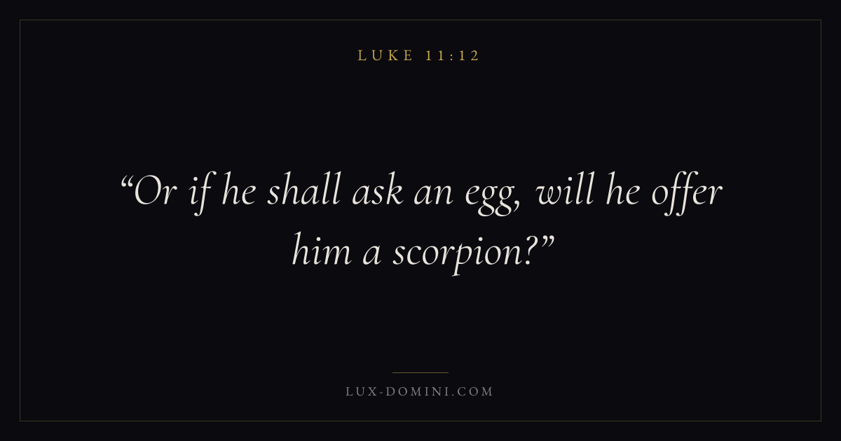 Books / Luke / Chapter 11 / Verse 12 ← Luke 11:11 Luke 11:12 Luke 11:13 → Or if he shall ask an egg, will he offer him a scorpion? Download verse card Share on Twitter Share on Facebook Pin it ✦ Key themes PrayerJustice and mercySalvationSpirit Read with Luke 11:11Luke 11:13Matthew 6:9Luke 18:1 Related topics Bible verses about prayerBible verses about justice and mercyBible verses about salvation ✦ Luke Chapter 11 verses V. 1 V. 2 V. 3 V. 4 V. 5 V. 6 V. 7 V. 8 V. 9 V. 10 V. 11 V. 12 V. 13 V. 14 V. 15 V. 16 V. 17 V. 18 V. 19 V. 20 V. 21 V. 22 V. 23 V. 24 V. 25 V. 26 V. 27 V. 28 V. 29 V. 30 V. 31 V. 32 V. 33 V. 34 V. 35 V. 36 V. 37 V. 38 V. 39 V. 40 V. 41 V. 42 V. 43 V. 44 V. 45 V. 46 V. 47 V. 48 V. 49 V. 50 V. 51 V. 52 V. 53 V. 54