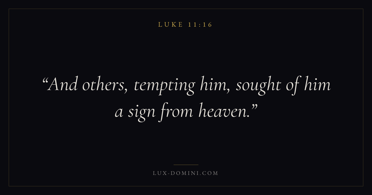 Books / Luke / Chapter 11 / Verse 16 ← Luke 11:15 Luke 11:16 Luke 11:17 → And others, tempting him, sought of him a sign from heaven. Download verse card Share on Twitter Share on Facebook Pin it ✦ Key themes PrayerJustice and mercySalvationSpirit Read with Luke 11:14Luke 11:15Matthew 6:9Luke 18:1 Related topics Bible verses about prayerBible verses about justice and mercyBible verses about salvation ✦ Luke Chapter 11 verses V. 1 V. 2 V. 3 V. 4 V. 5 V. 6 V. 7 V. 8 V. 9 V. 10 V. 11 V. 12 V. 13 V. 14 V. 15 V. 16 V. 17 V. 18 V. 19 V. 20 V. 21 V. 22 V. 23 V. 24 V. 25 V. 26 V. 27 V. 28 V. 29 V. 30 V. 31 V. 32 V. 33 V. 34 V. 35 V. 36 V. 37 V. 38 V. 39 V. 40 V. 41 V. 42 V. 43 V. 44 V. 45 V. 46 V. 47 V. 48 V. 49 V. 50 V. 51 V. 52 V. 53 V. 54