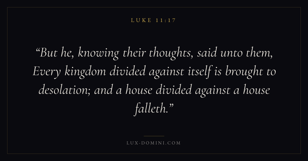 But he, knowing their thoughts, said unto them, Every kingdom divided against itself is brought to desolation; and a house divided against a house falleth.