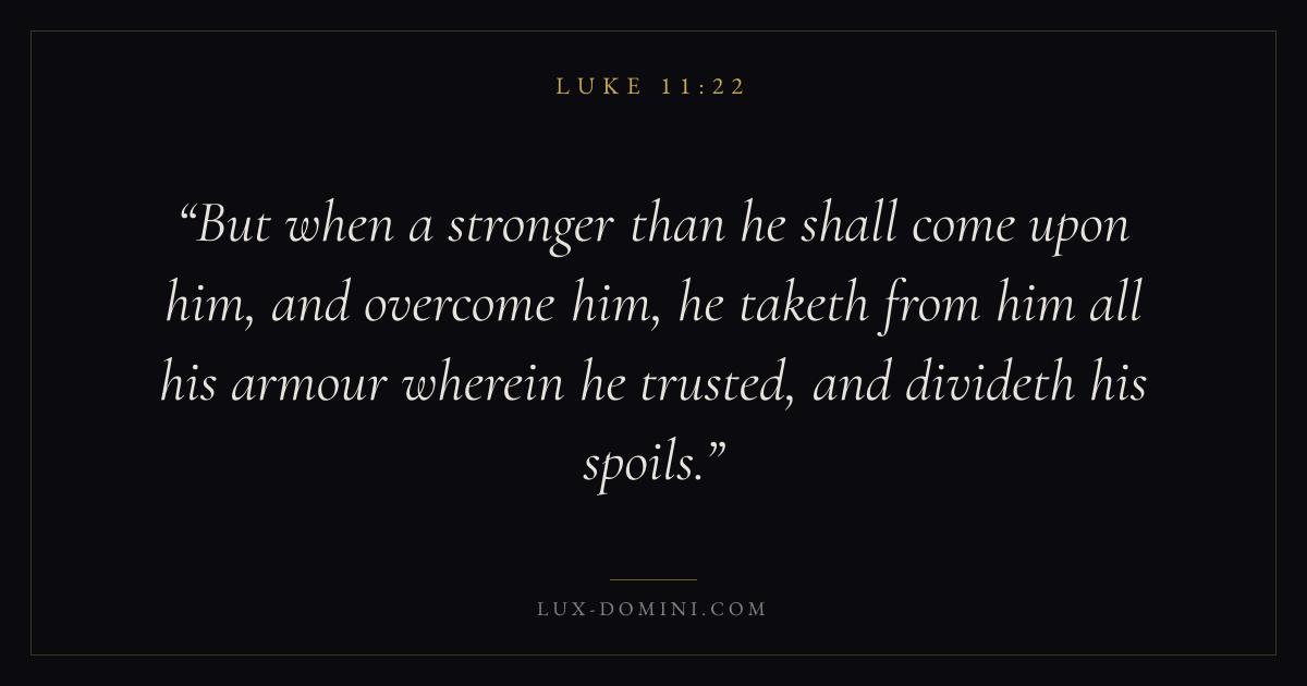 But when a stronger than he shall come upon him, and overcome him, he taketh from him all his armour wherein he trusted, and divideth his spoils.