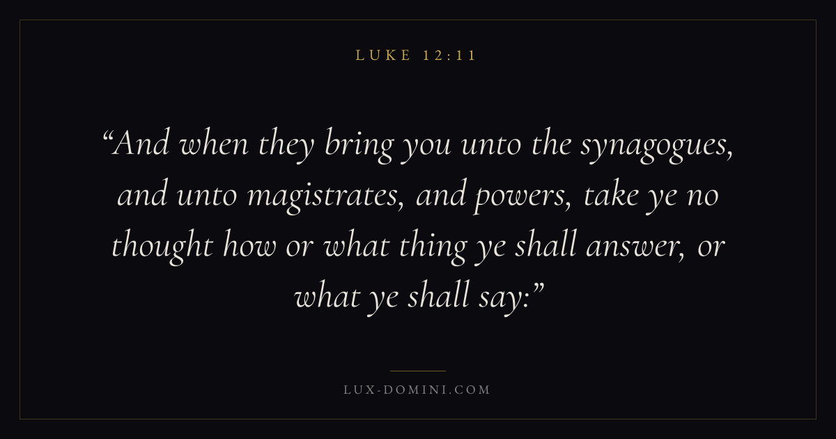 And when they bring you unto the synagogues, and unto magistrates, and powers, take ye no thought how or what thing ye shall answer, or what ye shall say: