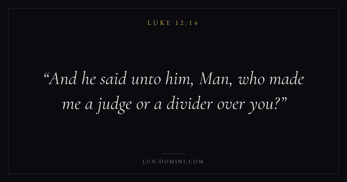 Books / Luke / Chapter 12 / Verse 14 ← Luke 12:13 Luke 12:14 Luke 12:15 → And he said unto him, Man, who made me a judge or a divider over you? Download verse card Share on Twitter Share on Facebook Pin it ✦ Key themes PrayerJustice and mercySalvationGraceSpirit Read with Luke 12:13Luke 12:15Matthew 6:9Luke 18:1 Related topics Bible verses about prayerBible verses about justice and mercyBible verses about salvationBible verses about grace ✦ Luke Chapter 12 verses V. 1 V. 2 V. 3 V. 4 V. 5 V. 6 V. 7 V. 8 V. 9 V. 10 V. 11 V. 12 V. 13 V. 14 V. 15 V. 16 V. 17 V. 18 V. 19 V. 20 V. 21 V. 22 V. 23 V. 24 V. 25 V. 26 V. 27 V. 28 V. 29 V. 30 V. 31 V. 32 V. 33 V. 34 V. 35 V. 36 V. 37 V. 38 V. 39 V. 40 V. 41 V. 42 V. 43 V. 44 V. 45 V. 46 V. 47 V. 48 V. 49 V. 50 V. 51 V. 52 V. 53 V. 54 V. 55 V. 56 V. 57 V. 58 V. 59