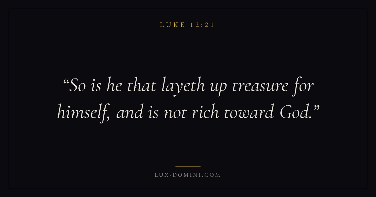Books / Luke / Chapter 12 / Verse 21 ← Luke 12:20 Luke 12:21 Luke 12:22 → So is he that layeth up treasure for himself, and is not rich toward God. Download verse card Share on Twitter Share on Facebook Pin it ✦ Key themes PrayerJustice and mercySalvationGraceSpirit Read with Luke 12:18Luke 12:19Matthew 6:9Luke 18:1 Related topics Bible verses about prayerBible verses about justice and mercyBible verses about salvationBible verses about grace ✦ Luke Chapter 12 verses V. 1 V. 2 V. 3 V. 4 V. 5 V. 6 V. 7 V. 8 V. 9 V. 10 V. 11 V. 12 V. 13 V. 14 V. 15 V. 16 V. 17 V. 18 V. 19 V. 20 V. 21 V. 22 V. 23 V. 24 V. 25 V. 26 V. 27 V. 28 V. 29 V. 30 V. 31 V. 32 V. 33 V. 34 V. 35 V. 36 V. 37 V. 38 V. 39 V. 40 V. 41 V. 42 V. 43 V. 44 V. 45 V. 46 V. 47 V. 48 V. 49 V. 50 V. 51 V. 52 V. 53 V. 54 V. 55 V. 56 V. 57 V. 58 V. 59