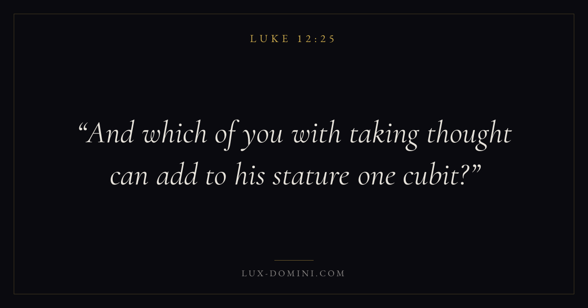 Books / Luke / Chapter 12 / Verse 25 ← Luke 12:24 Luke 12:25 Luke 12:26 → And which of you with taking thought can add to his stature one cubit? Download verse card Share on Twitter Share on Facebook Pin it ✦ Key themes PrayerJustice and mercySalvationSpirit Read with Luke 12:24Matthew 6:9Luke 18:1Micah 6:8 Related topics Bible verses about prayerBible verses about justice and mercyBible verses about salvation ✦ Luke Chapter 12 verses V. 1 V. 2 V. 3 V. 4 V. 5 V. 6 V. 7 V. 8 V. 9 V. 10 V. 11 V. 12 V. 13 V. 14 V. 15 V. 16 V. 17 V. 18 V. 19 V. 20 V. 21 V. 22 V. 23 V. 24 V. 25 V. 26 V. 27 V. 28 V. 29 V. 30 V. 31 V. 32 V. 33 V. 34 V. 35 V. 36 V. 37 V. 38 V. 39 V. 40 V. 41 V. 42 V. 43 V. 44 V. 45 V. 46 V. 47 V. 48 V. 49 V. 50 V. 51 V. 52 V. 53 V. 54 V. 55 V. 56 V. 57 V. 58 V. 59