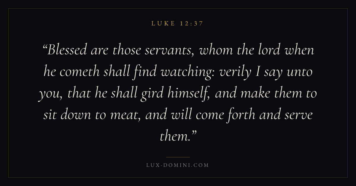Blessed are those servants, whom the lord when he cometh shall find watching: verily I say unto you, that he shall gird himself, and make them to sit down to meat, and will come forth and serve them.