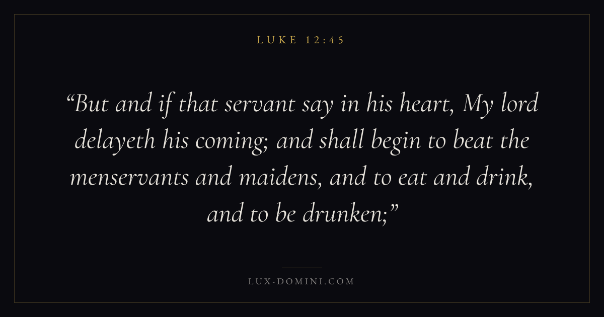 But and if that servant say in his heart, My lord delayeth his coming; and shall begin to beat the menservants and maidens, and to eat and drink, and to be drunken;
