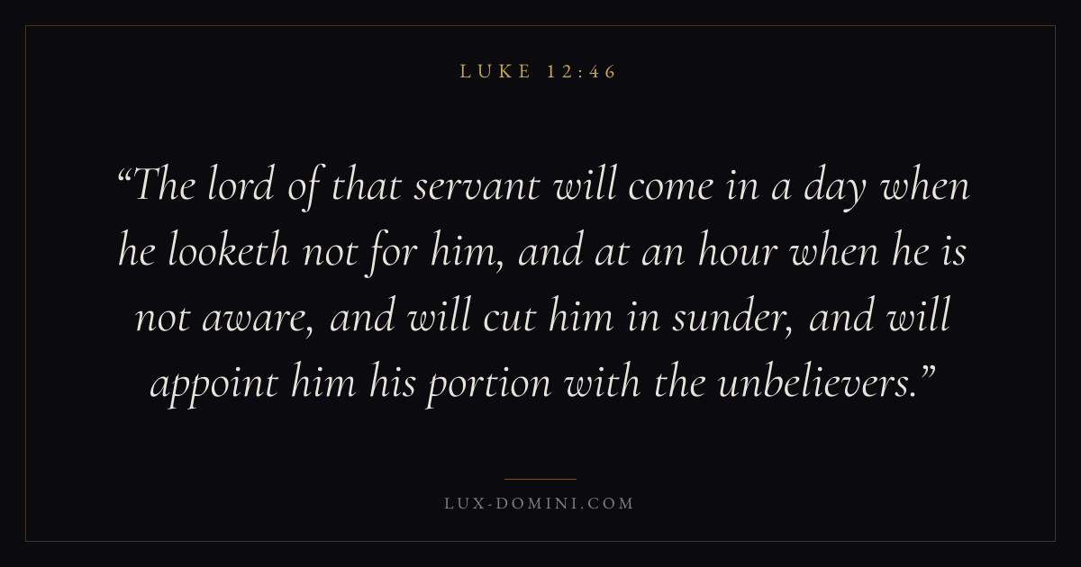 The lord of that servant will come in a day when he looketh not for him, and at an hour when he is not aware, and will cut him in sunder, and will appoint him his portion with the unbelievers.