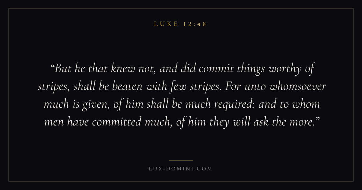 But he that knew not, and did commit things worthy of stripes, shall be beaten with few stripes. For unto whomsoever much is given, of him shall be much required: and to whom men have committed much, of him they will ask the more.