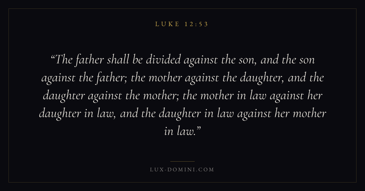 The father shall be divided against the son, and the son against the father; the mother against the daughter, and the daughter against the mother; the mother in law against her daughter in law, and the daughter in law against her mother in law.