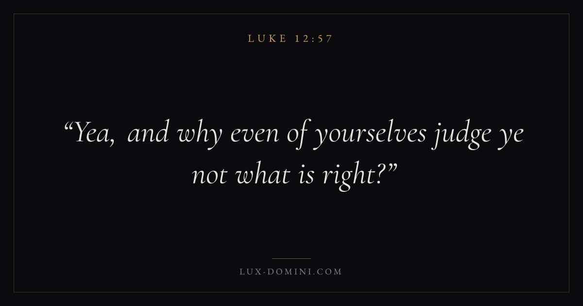 Books / Luke / Chapter 12 / Verse 57 ← Luke 12:56 Luke 12:57 Luke 12:58 → Yea, and why even of yourselves judge ye not what is right? Download verse card Share on Twitter Share on Facebook Pin it ✦ Key themes PrayerWisdomJustice and mercySalvationSpirit Read with Luke 12:54Luke 12:55Matthew 6:9Luke 18:1 Related topics Bible verses about prayerBible verses about wisdomBible verses about justice and mercyBible verses about salvation ✦ Luke Chapter 12 verses V. 1 V. 2 V. 3 V. 4 V. 5 V. 6 V. 7 V. 8 V. 9 V. 10 V. 11 V. 12 V. 13 V. 14 V. 15 V. 16 V. 17 V. 18 V. 19 V. 20 V. 21 V. 22 V. 23 V. 24 V. 25 V. 26 V. 27 V. 28 V. 29 V. 30 V. 31 V. 32 V. 33 V. 34 V. 35 V. 36 V. 37 V. 38 V. 39 V. 40 V. 41 V. 42 V. 43 V. 44 V. 45 V. 46 V. 47 V. 48 V. 49 V. 50 V. 51 V. 52 V. 53 V. 54 V. 55 V. 56 V. 57 V. 58 V. 59
