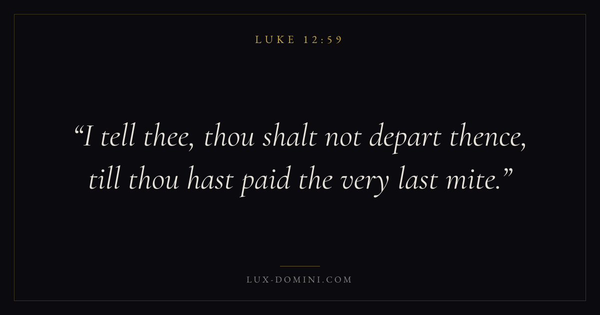 Books / Luke / Chapter 12 / Verse 59 ← Luke 12:58 Luke 12:59 Luke 13:1 → I tell thee, thou shalt not depart thence, till thou hast paid the very last mite. Download verse card Share on Twitter Share on Facebook Pin it ✦ Key themes PrayerWisdomJustice and mercySalvationSpirit Read with Luke 12:58Matthew 6:9Luke 18:1Proverbs 1:7 Related topics Bible verses about prayerBible verses about wisdomBible verses about justice and mercyBible verses about salvation ✦ Luke Chapter 12 verses V. 1 V. 2 V. 3 V. 4 V. 5 V. 6 V. 7 V. 8 V. 9 V. 10 V. 11 V. 12 V. 13 V. 14 V. 15 V. 16 V. 17 V. 18 V. 19 V. 20 V. 21 V. 22 V. 23 V. 24 V. 25 V. 26 V. 27 V. 28 V. 29 V. 30 V. 31 V. 32 V. 33 V. 34 V. 35 V. 36 V. 37 V. 38 V. 39 V. 40 V. 41 V. 42 V. 43 V. 44 V. 45 V. 46 V. 47 V. 48 V. 49 V. 50 V. 51 V. 52 V. 53 V. 54 V. 55 V. 56 V. 57 V. 58 V. 59