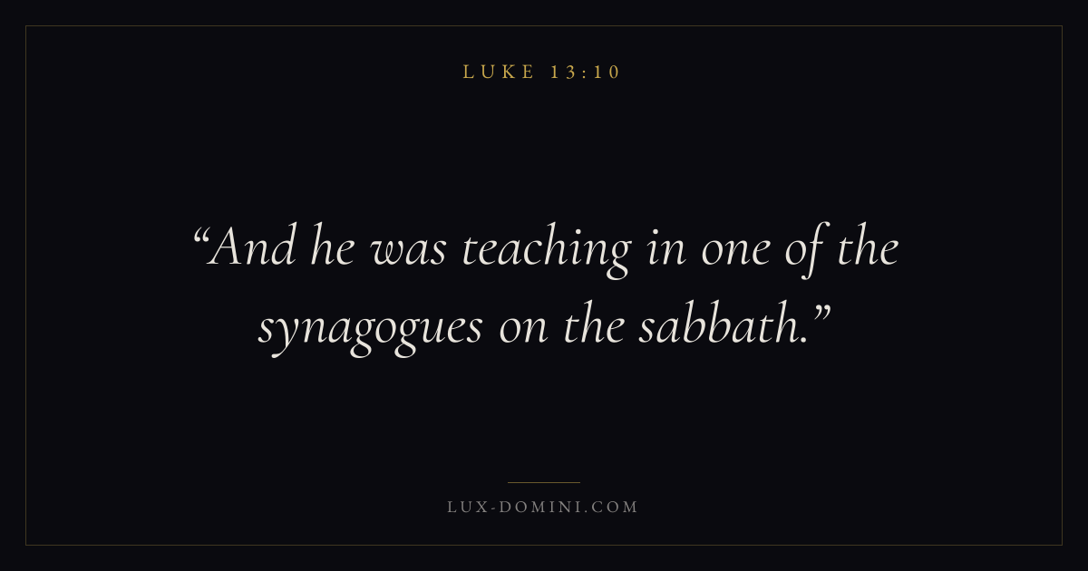 Books / Luke / Chapter 13 / Verse 10 ← Luke 13:9 Luke 13:10 Luke 13:11 → And he was teaching in one of the synagogues on the sabbath. Download verse card Share on Twitter Share on Facebook Pin it ✦ Key themes PrayerJustice and mercySalvationSpirit Read with Luke 13:6Luke 13:7Matthew 6:9Luke 18:1 Related topics Bible verses about prayerBible verses about justice and mercyBible verses about salvation ✦ Luke Chapter 13 verses V. 1 V. 2 V. 3 V. 4 V. 5 V. 6 V. 7 V. 8 V. 9 V. 10 V. 11 V. 12 V. 13 V. 14 V. 15 V. 16 V. 17 V. 18 V. 19 V. 20 V. 21 V. 22 V. 23 V. 24 V. 25 V. 26 V. 27 V. 28 V. 29 V. 30 V. 31 V. 32 V. 33 V. 34 V. 35