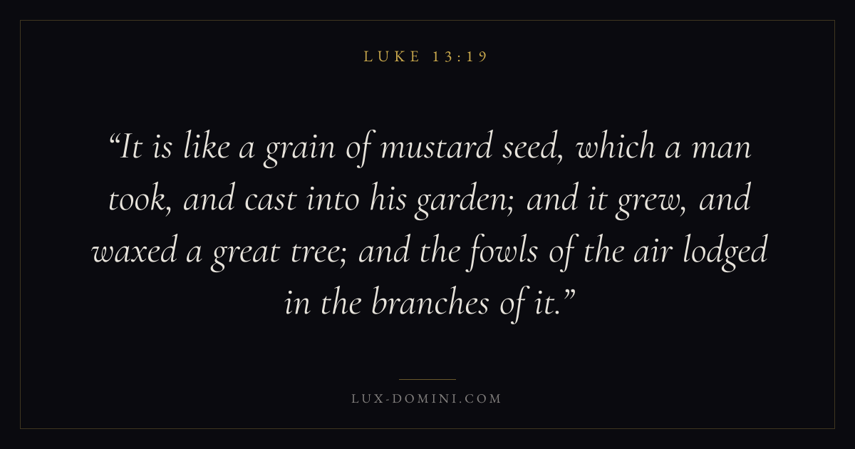 It is like a grain of mustard seed, which a man took, and cast into his garden; and it grew, and waxed a great tree; and the fowls of the air lodged in the branches of it.