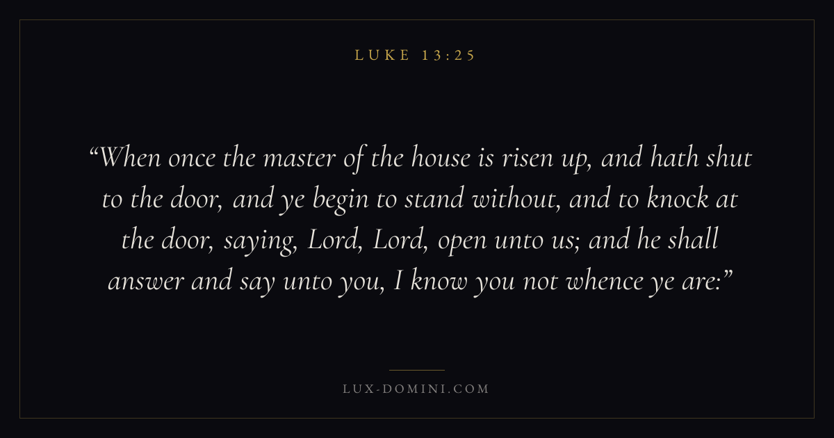 When once the master of the house is risen up, and hath shut to the door, and ye begin to stand without, and to knock at the door, saying, Lord, Lord, open unto us; and he shall answer and say unto you, I know you not whence ye are: