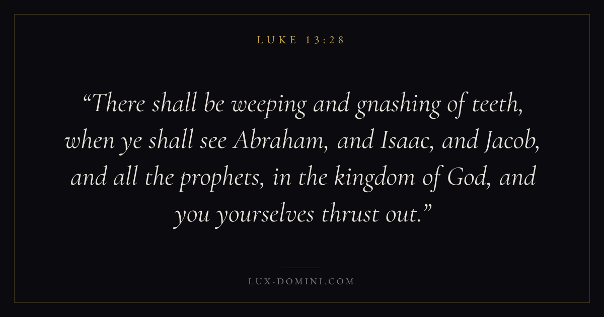There shall be weeping and gnashing of teeth, when ye shall see Abraham, and Isaac, and Jacob, and all the prophets, in the kingdom of God, and you yourselves thrust out.